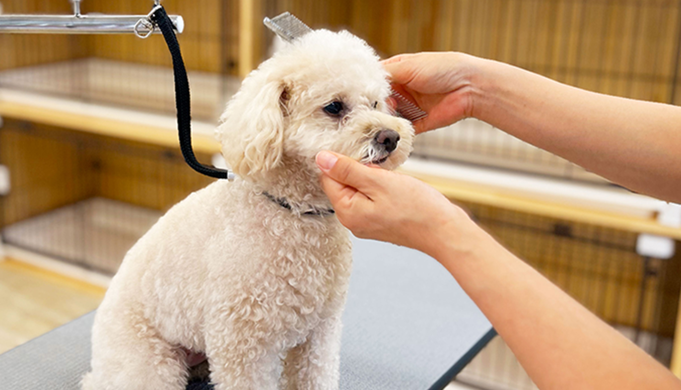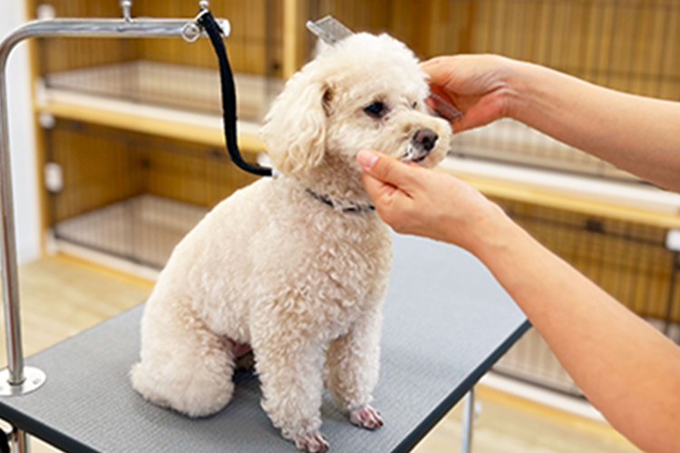 それぞれのワンちゃんのその日の体調や健康状態を確認し、ワンちゃんのペースやライフステージに寄り添いトリミングをおこないます。皮膚や、被毛の状態を確認し、使用するシャンプーやカットについて飼い主様と相談しながらご提案させていただきます。